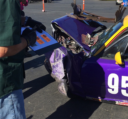 In the same race, Julie's car went off and hit the wall. I didn't see it, but I took pictures. Fortunately, it was the left side of the car, since they had just rebuilt the right side of the car after a crash in March.