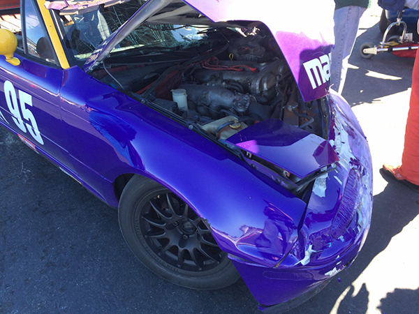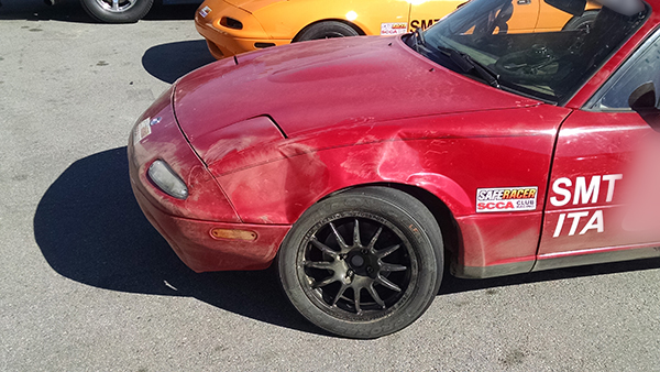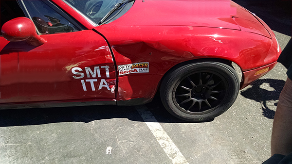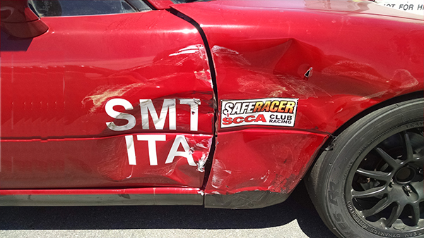 Next up was STL (among about 10 other classes for a very mixed group). There were less issues than the SM group, but we did have an interesting 3 car pileup coming out of T4 (video). Julie was part of it, but initially her car seemed OK, so she continued the race. But, her car would no longer track straight (indicative of a problem) so she pulled off on the back straight, electing not to take a broken car down the corkscrew. Here are some pics of the right side of her car (yup! the side that had just been rebuilt from before).