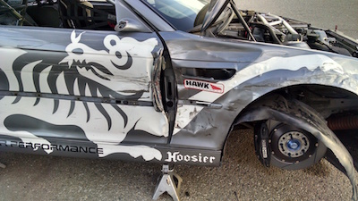 The car seemed OK, so I continued the race, and finished. When I got into impound (all cars are impounded after a championship race), I saw the extent of the damage.